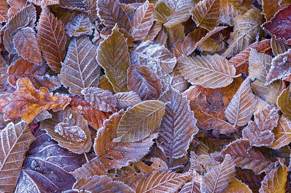 The logistics of shooting a close-up are also much easier, as most of us will have a back garden or local park. Look for backlit autumnal leaves, textures on tree trunks, old pieces of wood or decaying plant life. If there’s been a heavy dew look for water droplets on the end of leaves or spiders’ webs – they all make for interesting patterns, details and textures. The first early frosts of the autumn are even better, with everything etched with ice crystals. Look for ice patterns in the puddles and on plants with the last vestiges of their autumnal colour. Concentrate on where the light is coming from: backlighting is good for patterns and side lighting best for creating strong textures.